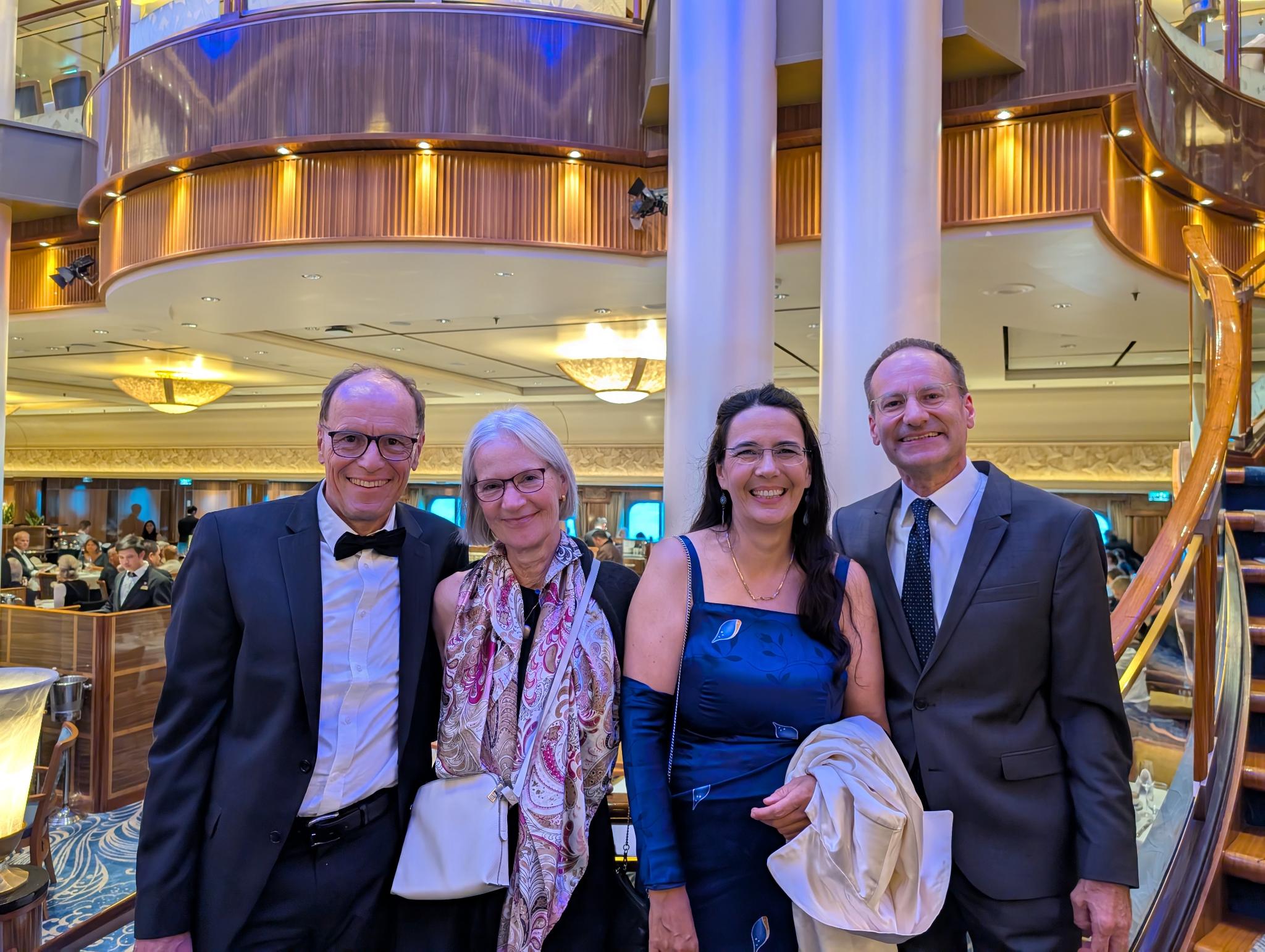 Zur Illustration hier noch wir vier, wie wir zum Gala-Abend am Dienstag angetanzt kamen: v.l.n.r.: Unsere beiden Freunde Niklaus Brändli und Yvonne Furrer, mit denen wir bis New York reisen und in New York noch drei Tage in der „Zeit-Reisen“-Gruppe (230 Teilnehmende) den Big Apple geführt erkunden werden.