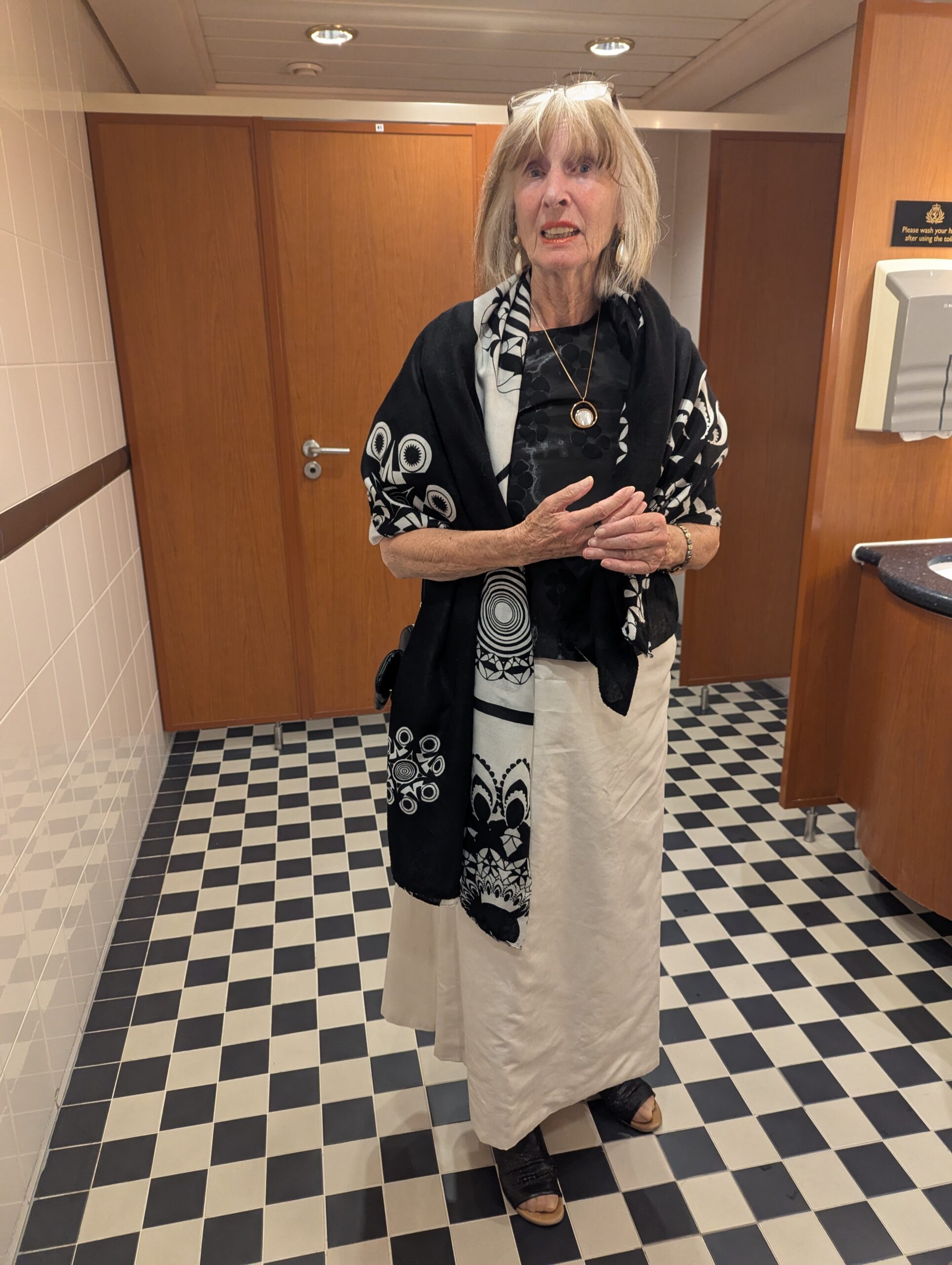 Ulla habe ich von meinem Projekt erzählt, dass ich mir vorgenommen habe, die fünf coolsten Black&white-Outfits für meinen Blog zu beschreiben und ein Foto dazu zu machen als Spickhilfe. Nun – dazu ist es nicht gekommen. Ich konnte mir lediglich ein sehr originelles Outfit merken und fotografier habe ich bloss Ulla an diesem Abend… Das originelle Outfit zuerst: Schlichter schwarzer Jupe, weisses Oberteil. Über dem Oberteil aber eine Art Paillettenvorhang aus einzelnen „Schnüren“ oder Ketten, die aus ca. 2 x 2 cm grossen, glänzenden Plastic-Quadraten bestanden in den Farben Weiss, Schwarz und Anthrazit. Also an einer Schnur hingen vielleicht so 20 Plastic-Qadrätchenbund von diesen Schnüren oder „Paillettenketten“ hatte die Dame etwa 20 nebeneinander drapiert… hatte ein bisschen den Look eines Lametta-Cheistbaums in Schwarz-Weiss (nee, im Ernst, es sah super aus). Yvonne meinte, sie habe das Gefühl, die Dame vom ARD irgendwie zu kennen – ihr Partner sei doch dieser Typ, der die ARD-Tagesschau moderiere… Nun – auch mir kam der Herr bekannt vor (sie waren an jenem Abend entfernte Tischnachbarn). Aber wir wollten in nicht stören. Ulla habe ich aber doch fotografiert, weil es eine längere Geschichte mit dieser witzigen, wohl über 80-jährugen Stuttgarter in auf sich hat und ich der Dame seither immer wieder über den Weg gelaufen bin. Beim Einschiffen am Montag warten Markus und ich in der Eincheckhallenauf unsere Freunde. Der Zufall wollte es, dass wir auf dem Bänkchen Platz genommen hätten, wo üädarüber ein A4- Blatt hing mit einer Anleitung für Passagiere, die noch kein ETA-Formular (Visum für England) ausgefüllt hatten. Und so lernten wir Ulla zum ersten Mal kennen. Ulla stand hilflos mit ihrem Handy in der Hand da und wusste nicht, wir sie den QR-Code scannen sollte… Markus in seiner hilfsbereiten Art versuchte mit Engelsgeduld zu helfen… später auch noch Ullas Kopf von rundherum mit dem Handy zu scannen für das 360-Grad-Bild fürs ETA-Formular. Zum Dank versprach uns Ulla, später auf der Queen Mary mal zu einem Drink einzuladen… Mal sehen, ob sie sich noch an ihr Versprechen erinnert. Aber am Black& White -Abend musste ich sie einfach nochmals ansprechen und die umtriebige Dame mit der Kamera festhalten 🙂