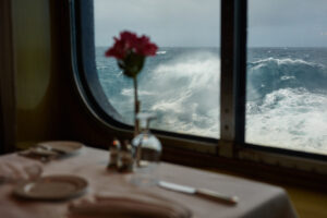 Mit der Queen Mary 2 fahren wir 35 km/h, der Wind kommt uns mit bis zu 60 km/h entgegen. Zusammengenommen ergibt das bis zu 95 km/h, die uns entgegenblasen, wenn wir die Nase rausstrecken. Dazu kommt der hohe Wellengang von sechs Metern. Es ist ein bisschen wie auf der Achterbahn: mal drückt es dich nach unten, mal hebst du fast ab. Den Gang entlang gehen oder Treppen steigen wird so zur Gleichgewichtsübung auf Meisterstufe. Meine Pilatestrainerin wird sich über meine Fortschritte freuen. Trotz tobender Elemente zieht die Queen Mary ruhig ihre Linie. Die Winde gellen, die Karawane zieht weiter, könnte man sagen. So können wir den Wettstreit der Naturgewalten mit neugierigem Interesse verfolgen, während uns der Kellner Scones anbietet und Tee nachschenkt.
