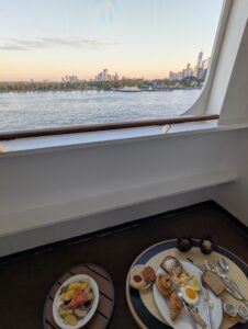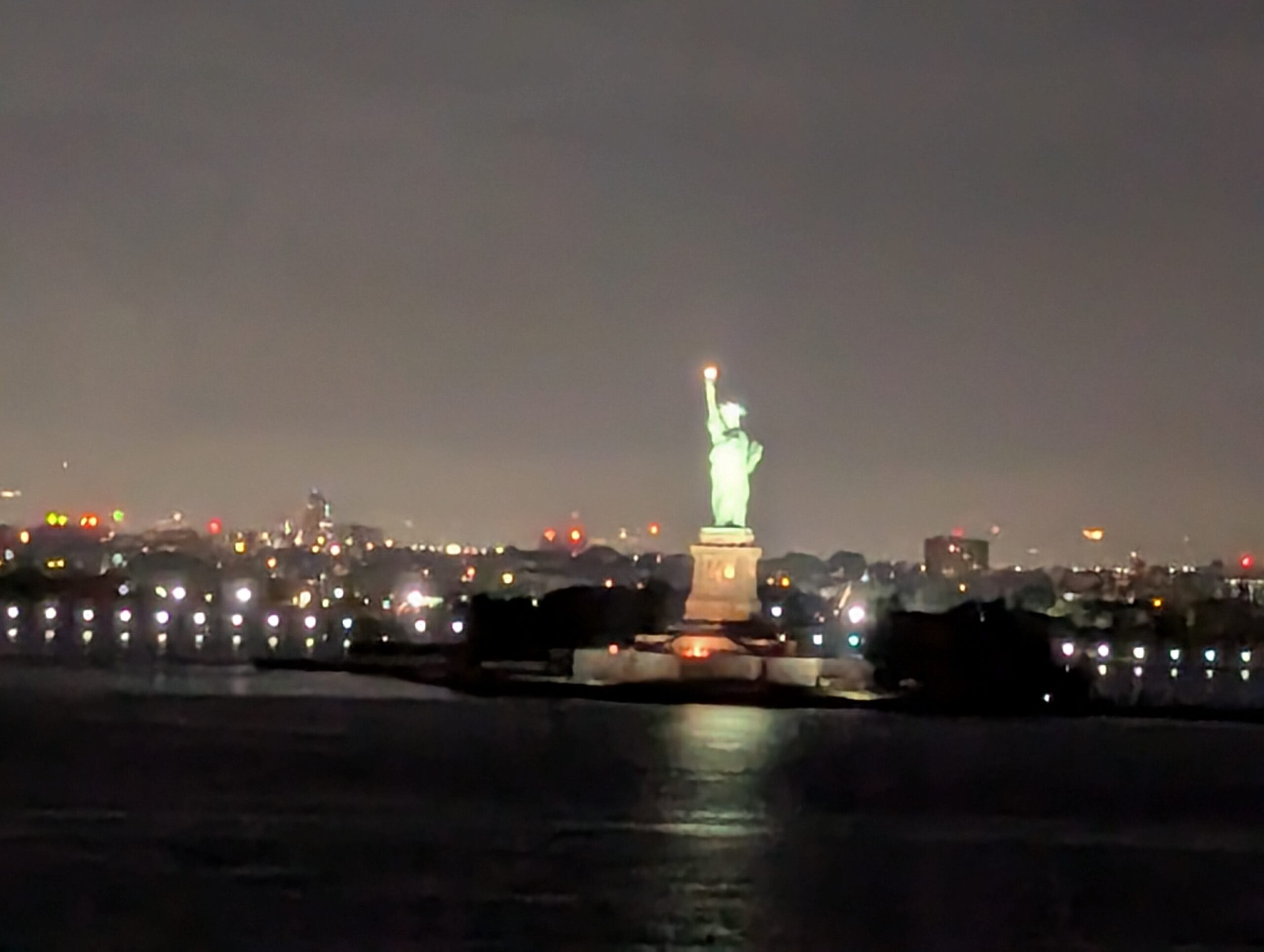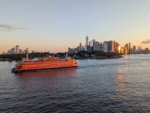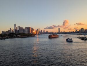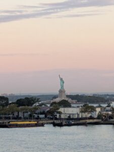 Hey, wir habens geschafft! Seit gestern Mittwoch laufen unsere Füsse durch die unglaublich coole, lebendige, (u.a. architektonisch) spannende, beeindruckende Stadt, die uns von der ersten Minute an fesselt. Sie ist um ein Vielfaches schöner als gedacht und hat trotz der vielen Wolkenkratzer einen unglaublichen Charme und eine entspannte Gemütlichkeit, wie wir sie uns niemals so vorgestellt hatten. Doch von vorne: Der gestrige Tag war unglaublich lange. Bereits um 3 Uhr erwachte ich. Auf 3.30 hatten wir den Wecker gestellt, denn dann würde die aufregende Anfahrt auf Manhatten und die Freiheitsstatue beginnen. Um ca. 04.20 passieren wir die Verrazano-Brücke: nachts unglaublich schön mit den beleuchteten Bögen der Brücke, die übrigens aus der Zeichen- und Konstruktionsfeder eines ETH-Absolventen stammt. Die Queen Mary 2 schrammte mit kaum einer Handbreit Abstand (das Schiff hat 13 Decks) unter der Brücke durch. Danach folgte ein zweieinhalbstündiges Traumschauspiel: von der ersten spielzeugklein in der Ferne auftauchenden Skyline Manhattens bis zur Freiheitsstatue, vorbeiziehenden Lastschiffen, Kähnen, Lotsen, Fähren etc. konnten wir bei extremem Wetterglück und tollem Morgenlicht ein wahrlich einmaliges Schauspiel mitverfolgen, wie es wohl Tausenden von Auswanderern und Auswandererinnen seit den Anfängen der Schifffahrt im 19. Jahrhundert bis in die 1950er Jahre erging. Danach wurde die transatlantische Überfahrt per Schiff ja allmählich durch das Fliegen abgelöst, und spätestens seit den 1970ern wurde das Fliegen für die Normalsterblichen erschwinglich. Schade, wie wir finden. Denn so eine Überfahrt per Schiff ist schon etwas Besonderes. Sie bringt einem näher an die Elemente, macht Distanzen erfahrbar, und man hat auf dem Schiff wunderbar Zeit, um runterzukommen von der Alltagshektik (falls man in einer solchen ab und an gefangen ist). Zurück zum Blick auf die Liberty und Manhatten (und die anderen imposanten Stadtteile New Yorks und New Jerseys vom Wasser aus: zwei Stunden lang standen wir auf verschiedenen Decks draussen und starrten (mit diesmal vielen vielen anderen Passagieren) die faszinierende Kulisse an, die ruhig und in allen Farbtönen der Morgendämmerung an uns vorbeizog. Meistens war man auf dem obersten Schiffsdeck nämlich sonst fast mutterseelen allein gewesen die letzten 10 Tage. Bloss einige Schweizer (ca. 100 Passagiere der 2500 Gäste sind CH, dann folgen 800 Deutsche, der Rest sind Engländer und die grosse Mehrheit US-Amerikaner). Doch die Schweizer stellen immerhin die viertgrösste Gruppe (wohl Aufgrund der Finanzkraft) dar. Wir vermuteten, dass es die Schweizer jeweils aufs Dachdeck des Schiffs zog, weil wir uns an schwindelwrrwgende Höhe, stürmische Winde und Regenschauer (die es während der erste fünf Tage der Überfahrt durchaus gab) gewohnt sind… Also: wir waren von der Anfahrt auf New York zu schlicht begeistert, hin und weg! Schaut selbst!