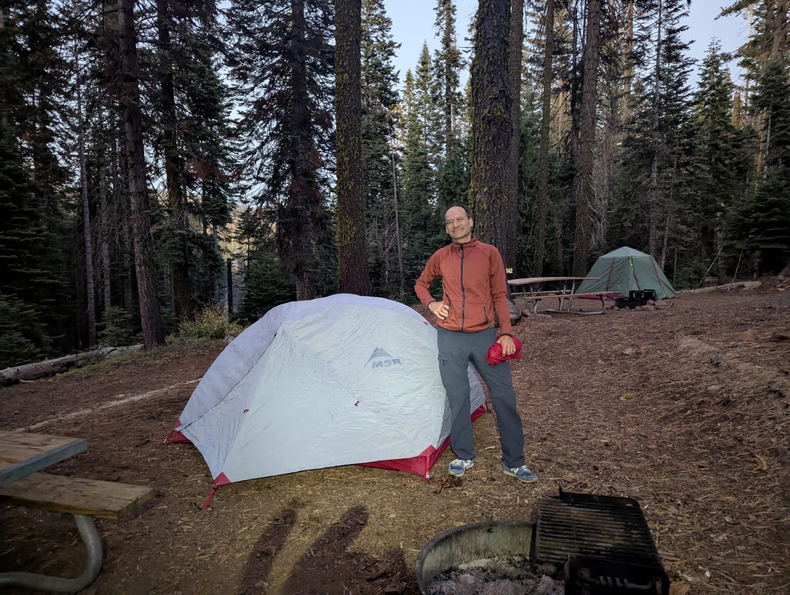 Markus, mein Held, ist heute die rund 300 Kilometer von San Francisco hierher und hoch auf knapp 1700 Meter alles allein gefahren und hat soeben auch noch das Zelt aufgestellt. Bin ihm sehr dankbar. Heute war nicht so mein Tag. Ich habe bloss den Locker eingeräumt und das WC-Häuschen inspiziert.
