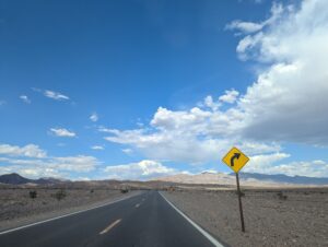 Danke, ja, wir geniessen es immer noch sehr. Der Tag gestern war in der Tat einer der eindrücklichsten Erlebnisse. Wir sind vom Städtchen Bishop auf etwa 1300 Metern über Meer bis ins Death Valley hinunter gefahren. Dieses besteht aus zwei durch einen langgezogenen Mittelhügel getrennte, flache Gräben, deren eine Talsohle auf 60 Meter unter Meeresniveau liegt. Eine ziemlich halsbrecherische Strasse führt in steilen Abwärtskurven die etwa 1000 Meter Höhendifferenz in die erste Talsohle hinab. Unser Mitreisender Niklaus hätte wohl seine Freude an der Autofahrt gehabt 😉 (wir haben uns ja nach New York von Yvonne und Niklaus getrennt – sie sind durch New England, Maine und bis anndie kanadische Grenze gefahren mit einem gemieteten roten Sportwagen :-)) Auch ich fand das Fahren auf der Bergstrasse ziemlich cool (ich sass den ersten Teil am Steuer), aber auch nur, weil die Amerikaner ja wirklich vor jeder Kurve ein Warnschild hinmachen und die Geschwindigkeit auf ein ungefährliches Mass beschränken…. So kamen wir ohne grosse Schwierigkeiten unten an. Unten heisst: im Backofen! Da das Tal eingekesselt ist durch steile Felswände und es dort absolut keine Vegetation gibt (ausser einigen dürren Steppengräsern), heizt sich das Klima im Sommer auf über 50 bis fast 60 Grad auf! Das Trügerische ist: es weht ein trockener Wind, der je nachdem den Eindruck erweckt, es sei gar nicht so heiss. Weil der Schweiss auf der Haut sofort verdunstet. Bei uns war es jetzt – Ende September – vielleicht noch so 45 Grad… keine Ahnung. 105 Grad Fahrenheit zeigte das Aussenthermometer des Autos mal an. Lange Zeit waren wir ohne Klimaanlage im Auto unterwegs, weil Markus diese aus Energiespargründen unnötig findet. Tatsächlich reichte uns auch im Death Valley lange Zeit ein offenes Fenster. Später am Nachmittag setzte ich mich irgendwann durch und machte die AC an, weil es doch langsam unerträglich heiss wurde im Auto.