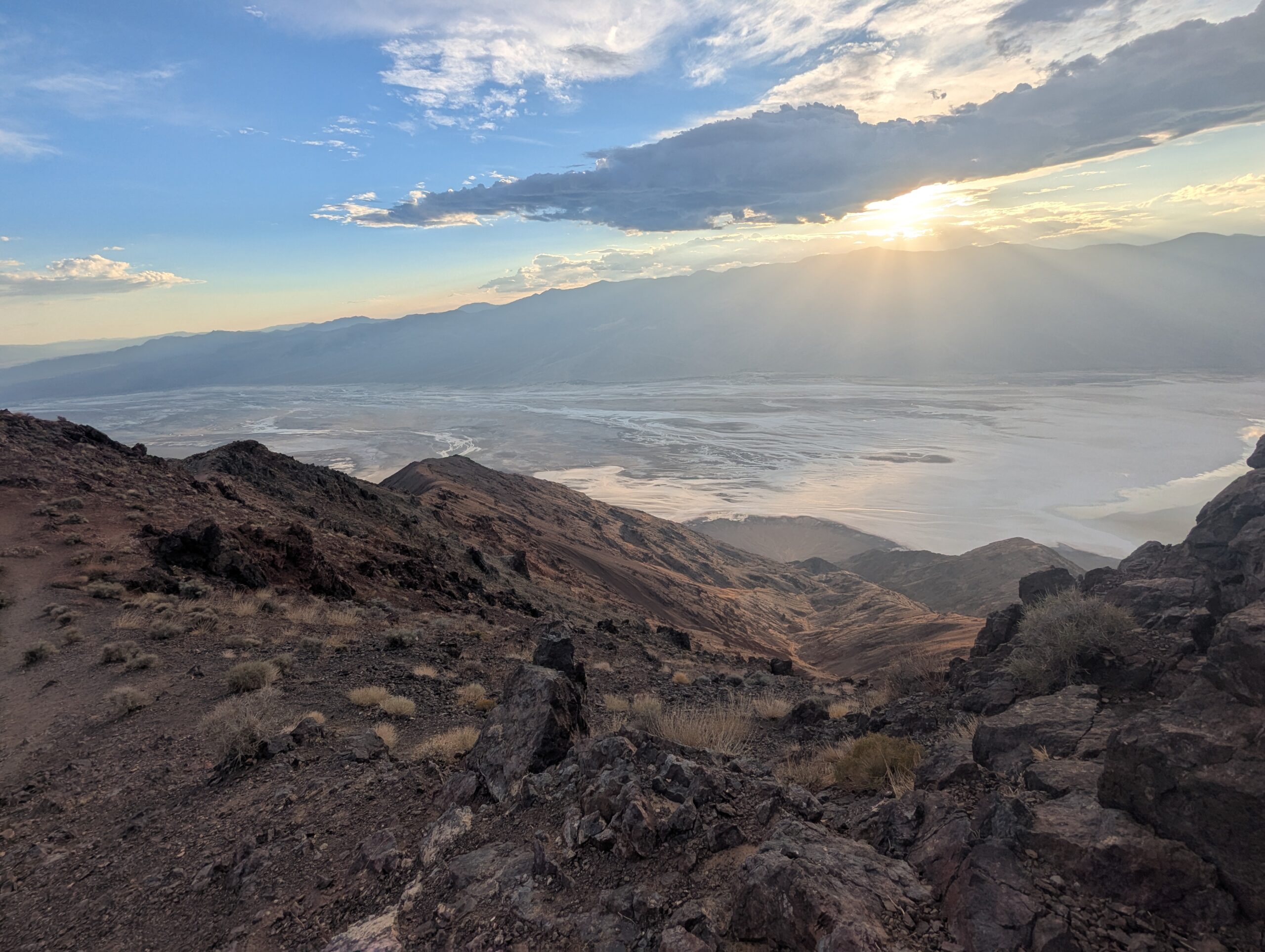Wir hatten irgendwie sehr Glück mit dem Wetter, denn es war ab und zu bewölkt und Abends zog sogar ein Gewitter auf (was die Stimmung mega dramatisch werden liess). Da es bereits in der Nacht oder am Vortag geregnet hatte, war die eine Talsohle des Death Valley teils mit einem seichten See gefüllt, in dem sich die Wolken spiegelten. Von einem Aussichtspunkt, dem Dante’s View Point aus, von dem man über das ganze Tal sieht, sah es mega schön aus!